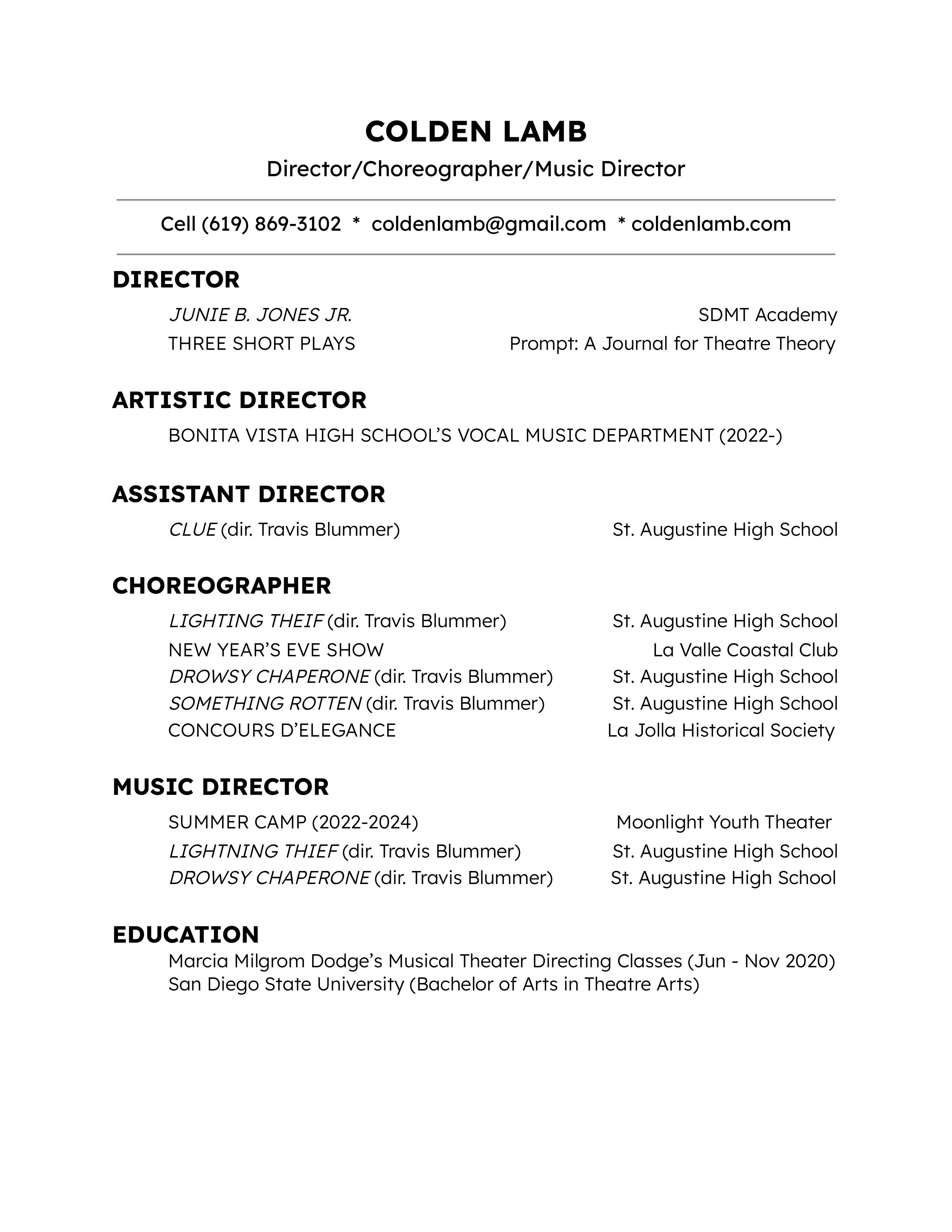 Colden Lamb Directing Resume